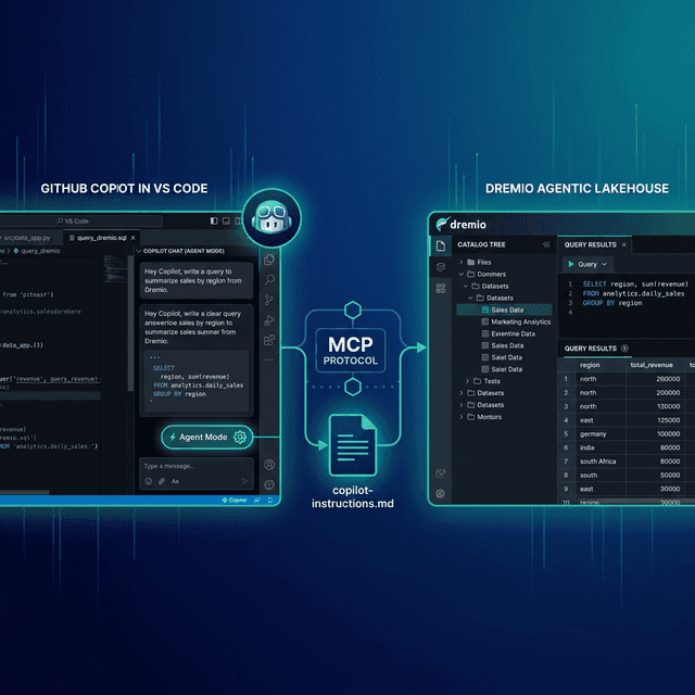 Copilot’s copilot-instructions.md file and .vscode/mcp.json configuration make it straightforward to integrate project-specific Dremio conventions and live data access into your workflow.