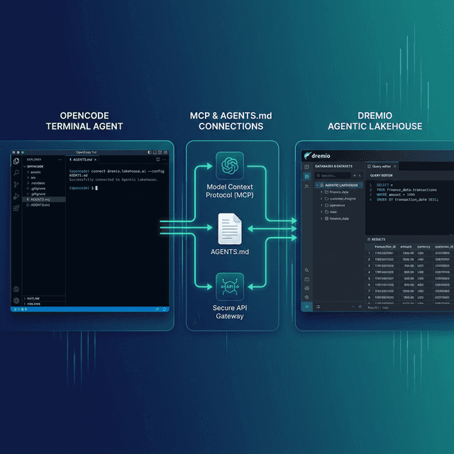 The open-source philosophy aligns. Dremio stores data in open formats with no vendor lock-in. OpenCode gives you full control over your AI coding agent with no proprietary restrictions. Connecting them means your open-source agent can query an open lakehouse, validate SQL against real schemas, and generate scripts using your team’s actual conventions.