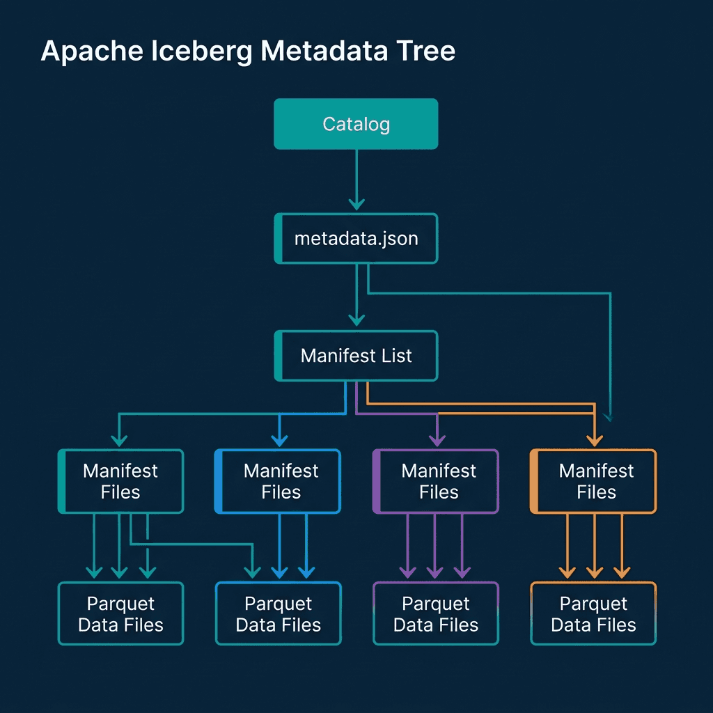 This strict tree structure means the engine knows exactly which Parquet files it needs to read before touching the raw data.
