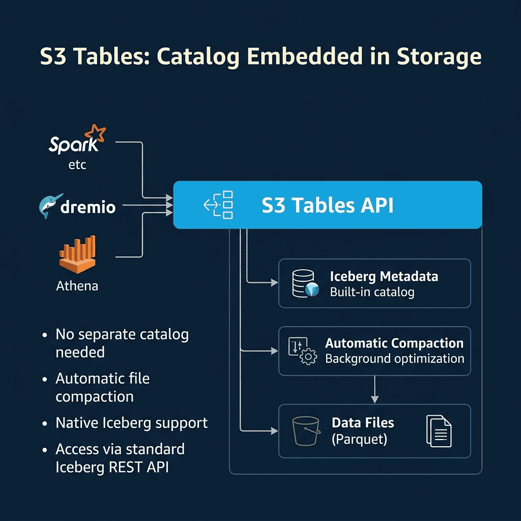 AWS launched S3 Tables in late 2024 as a new S3 bucket type designed specifically for Iceberg tables. When you create an S3 table bucket, AWS manages the Iceberg catalog internally.