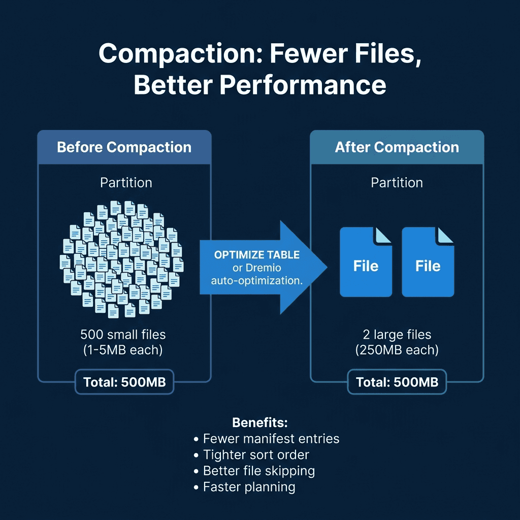 CALL system.rewrite_manifests('analytics.orders')This speeds up scan planning because the engine reads fewer manifest files. Each manifest file requires a separate I/O operation to read, so reducing the count from 500 to 20 eliminates 480 I/O round trips during query planning.