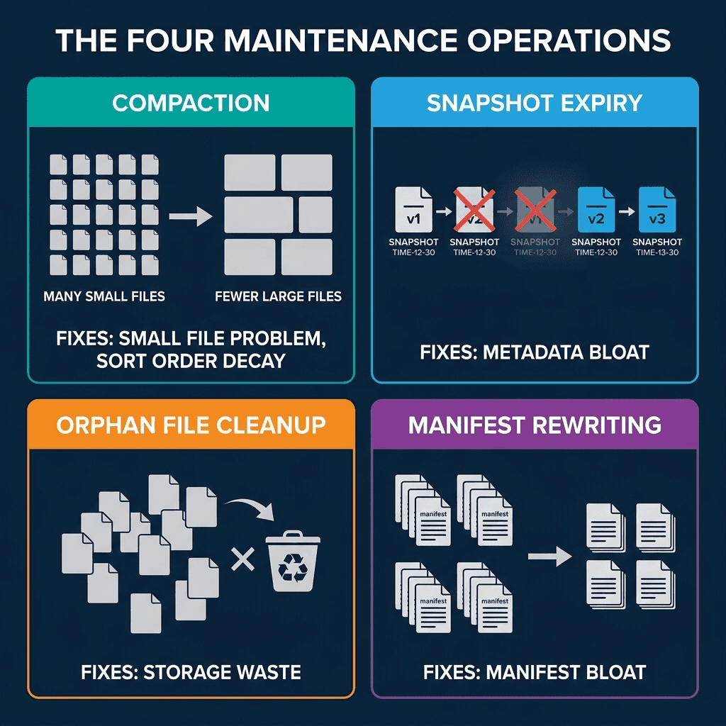This is Part 10 of a 15-part Apache Iceberg Masterclass. Part 9 covered how tables degrade. This article covers the four maintenance operations that keep Iceberg tables healthy and the three approaches to running them.