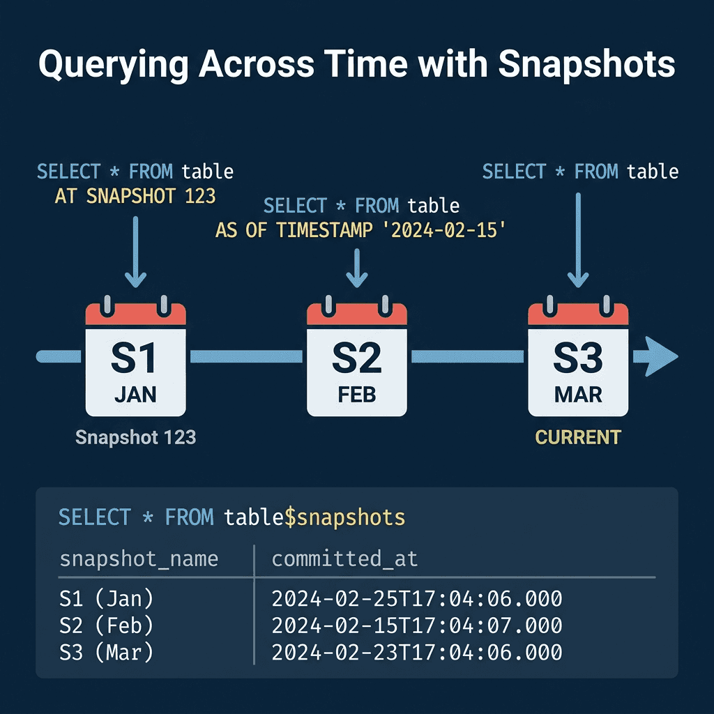 AT TIMESTAMP '2024-02-15 00:00:00'Time travel is useful for debugging data issues (“what did this table look like before yesterday’s pipeline ran?”), auditing (“what was the account balance at end-of-quarter?”), and reproducible analysis (“run this report against last month’s data”).