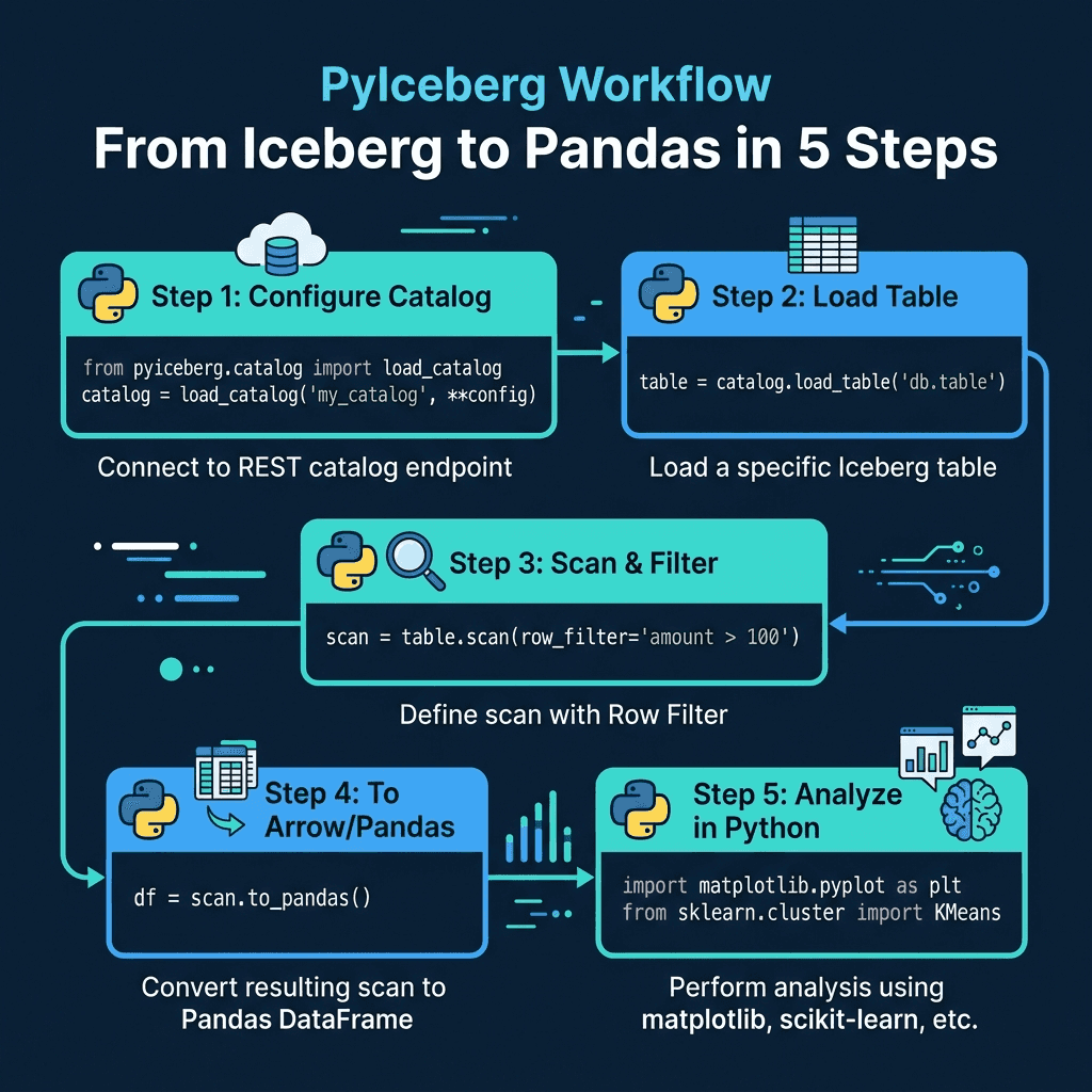 PyIceberg is the official Python library for Apache Iceberg. It reads Iceberg metadata directly and can scan data files without an external query engine.