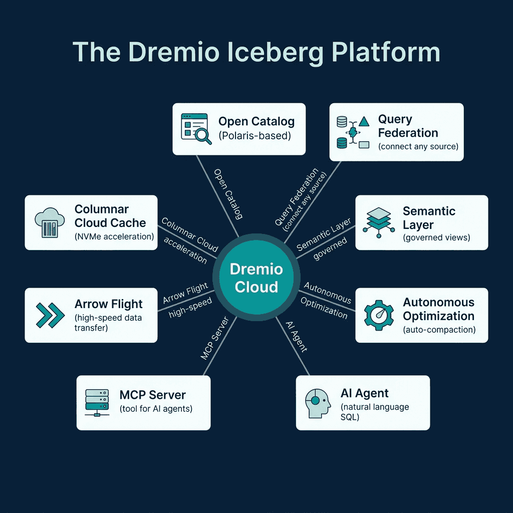 This positions Dremio as the data layer for agentic AI workflows: the AI agent asks questions in natural language, MCP translates them into governed SQL, and Dremio returns the results from optimized Iceberg tables.