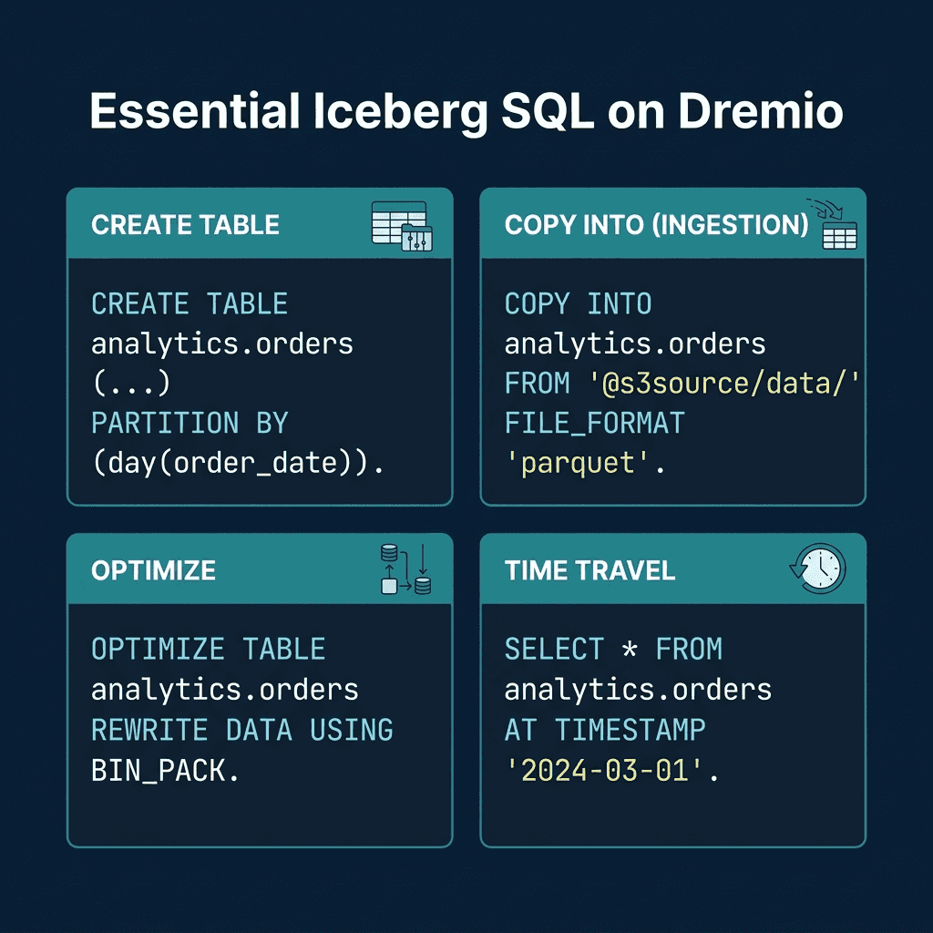 PARTITION BY (day(order_date))This creates a table with hidden partitioning by day. Users query on order_date naturally; the engine handles partition pruning automatically.